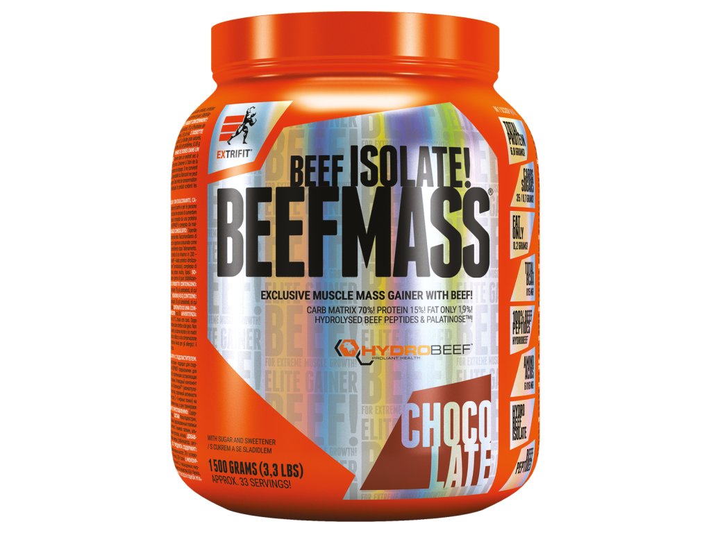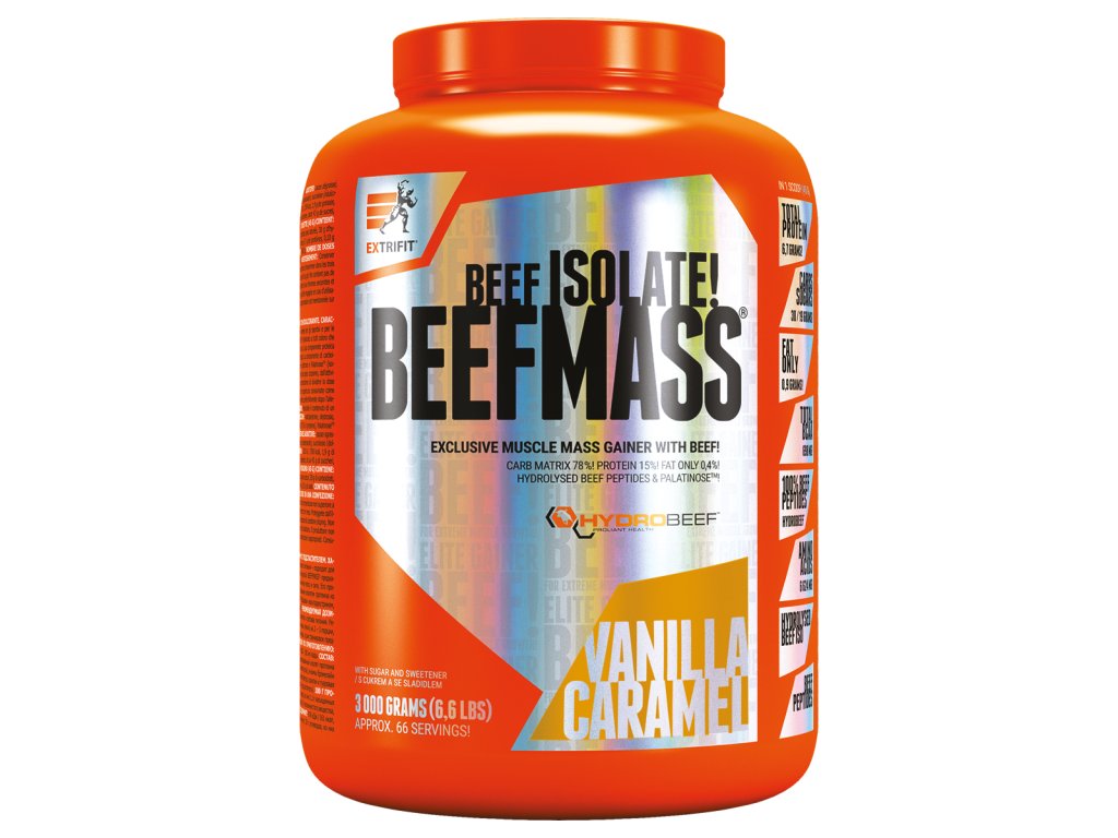 Značkový hovězí proteinový izolát HydroBEEF® (hydrolyzované hovězí peptidy) s obsahem 97 % hovězích bílkovin tvoří proteinový základ gaineru BeefMass®. Ten jsme doplnili kvalitním matrixem sacharidů pro maximální nárůst síly a svalové hmoty. BeefMass® je nový gainer, který obsahuje hydrolyzovanou izolovanou hovězí bílkovinu, jejíž předností je prakticky nulový obsah tuku a cukru. Hovězí proteinový izolát HydroBEEF® je jeden z nejkvalitnějších bílkovinných zdrojů. Užívání hovězí bílkoviny má v silových sportech dlouhou tradici. BeefMass® je určen pro všechny, kdo usilují o nárůst svalové hmoty a síly. BeefMass® v příchuti čokoláda neobsahuje laktózu.