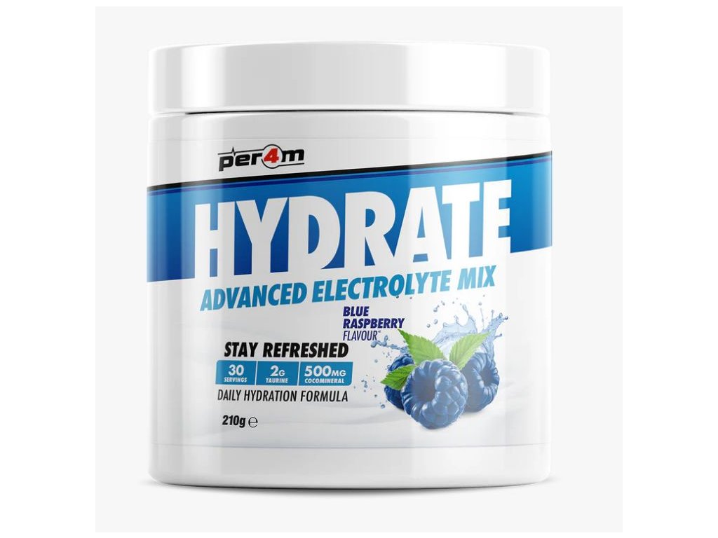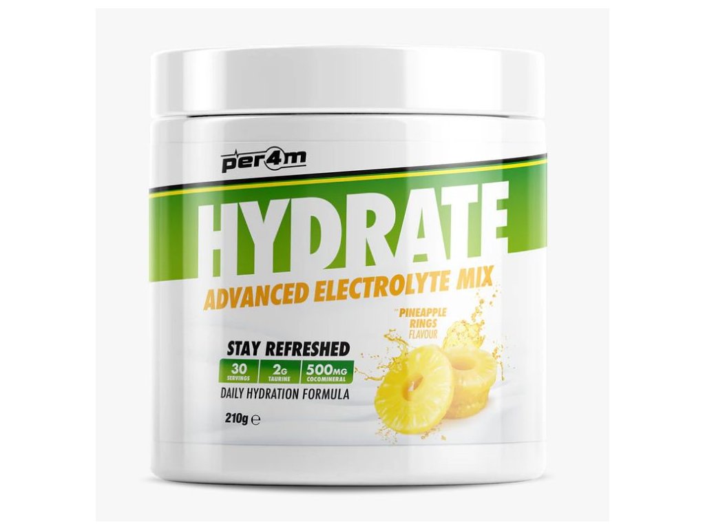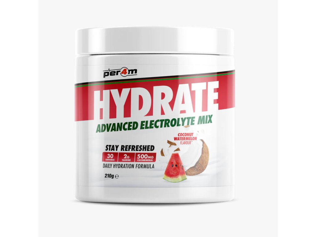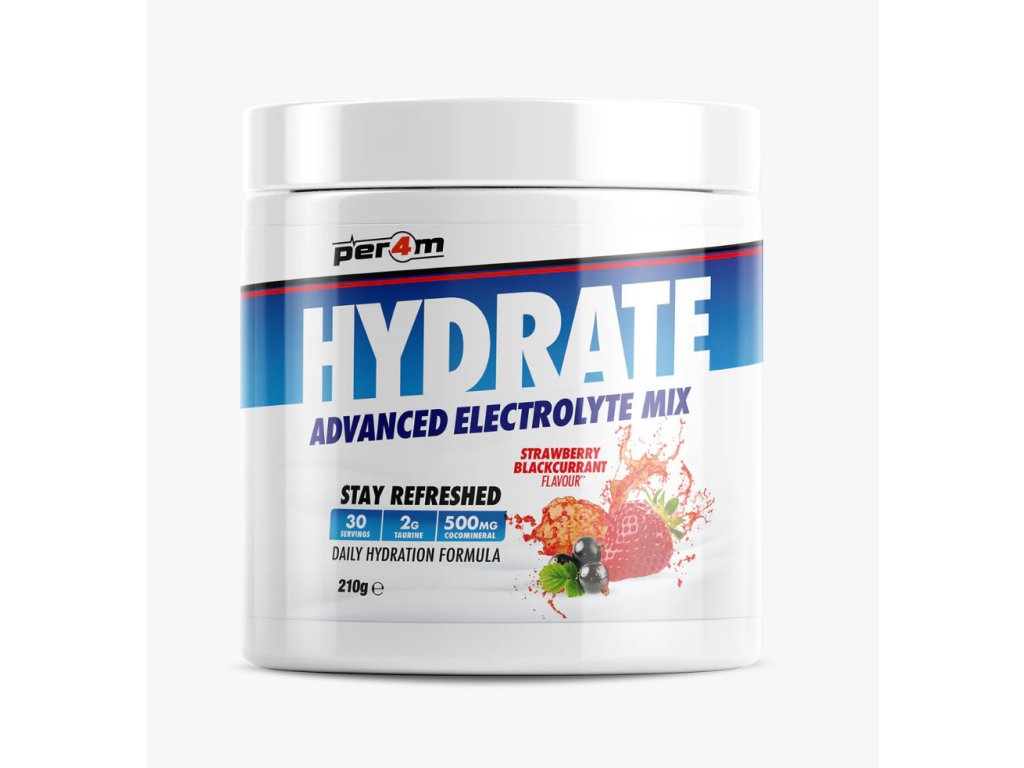 Představujeme další úžasný doplněk Per4m, který doplňuje jejich stále se rozšiřující řadu bestsellerů! Per4m Hydrate je pokročilá směs elektrolytů v prášku vytvořená jako doplněk denní hydratace s přídavkem taurinu, který je známý pro svou schopnost hydratace buněk a vyrovnávání elektrolytů, a také „CocoMineral“, patentovaný prášek z kokosové vody bohatý na minerály sodík a draslík, ideální pro obnovu našich zásob po tréninku!
