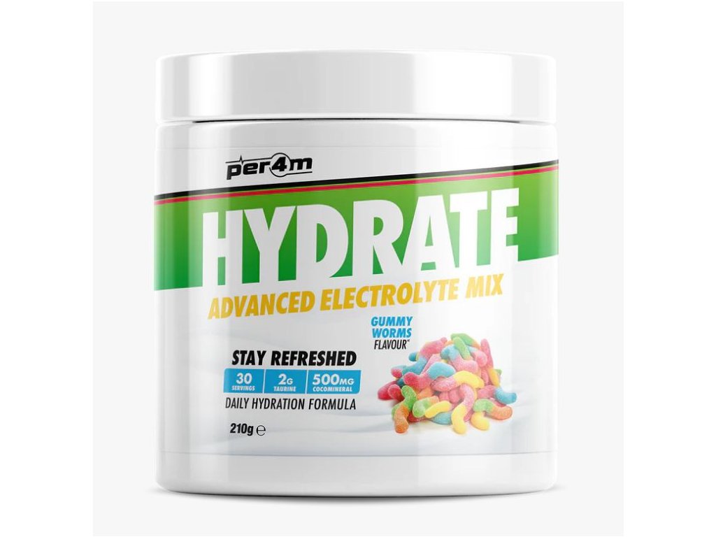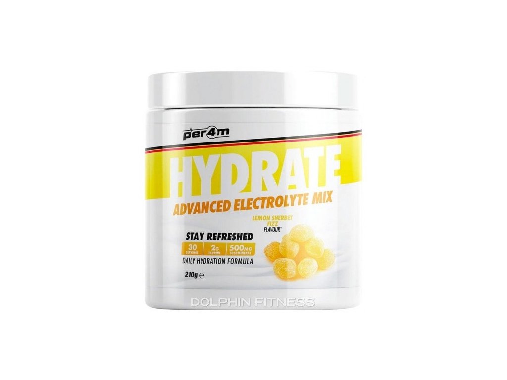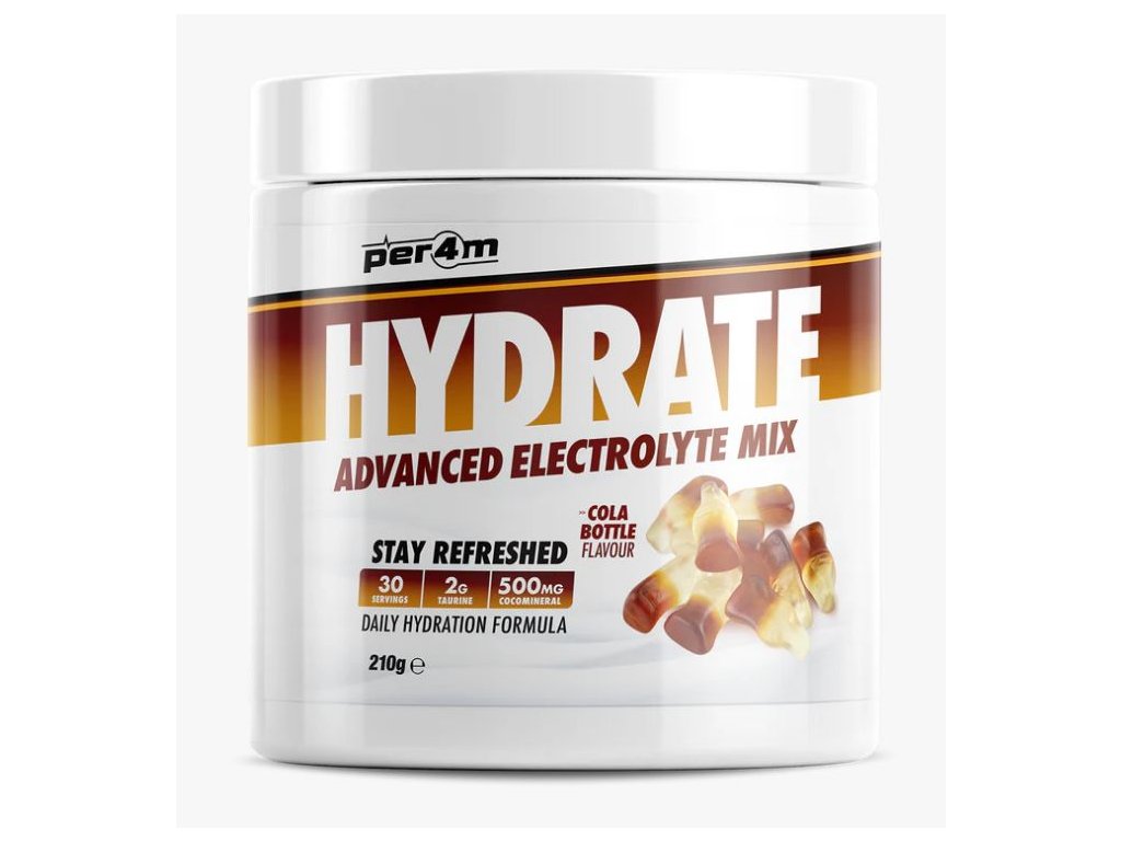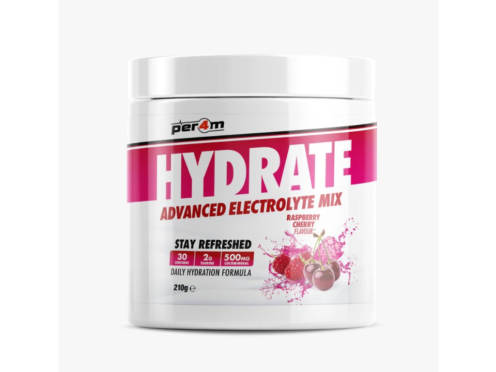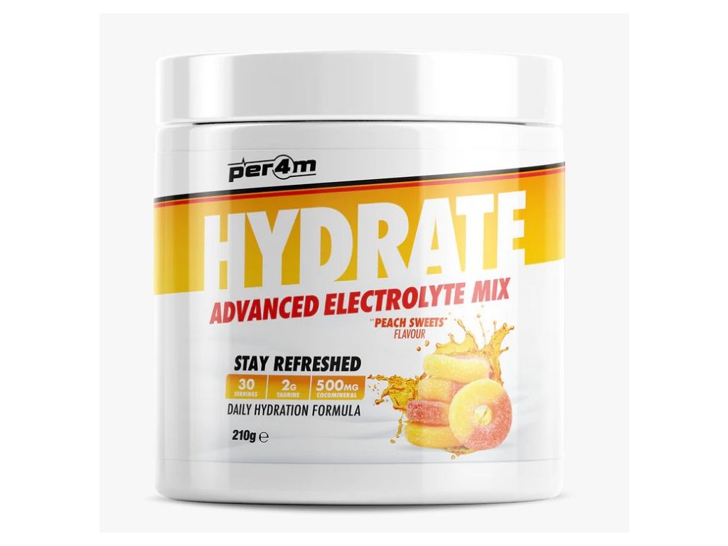 Představujeme další úžasný doplněk Per4m, který doplňuje jejich stále se rozšiřující řadu bestsellerů! Per4m Hydrate je pokročilá směs elektrolytů v prášku vytvořená jako doplněk denní hydratace s přídavkem taurinu, který je známý pro svou schopnost hydratace buněk a vyrovnávání elektrolytů, a také „CocoMineral“, patentovaný prášek z kokosové vody bohatý na minerály sodík a draslík, ideální pro obnovu našich zásob po tréninku!