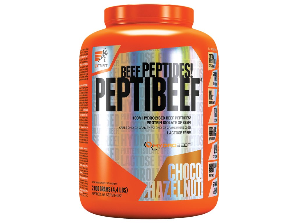 Extrifit PeptiBeef ® je hydrolyzovaná hovězí bílkovina - značkový izolát HydroBEEF® (hydrolyzované hovězí peptidy), obsahující masové (cca 25 %) a kosterní (cca 75 %) bílkoviny. Produkt má největší podíl bílkoviny z masa ze všech hovězích produktů na trhu. Protein je hydrolyzovaný, tzn. výsledné peptidy jsou velmi rychle stravitelné a pro lidský organismus rychle využitelné. Přibližně 15 % peptidů HydroBEEF® má molekulární hmotnost 6000 Da, 55 % 3000 Da a 30 % 500 Da a méně, což jsou velmi krátké (ve sportovní výživě velmi ceněné) peptidy s extrémně dobrou vstřebatelností a využitelností. Po rozmíchání vznikne napěněný šejk.